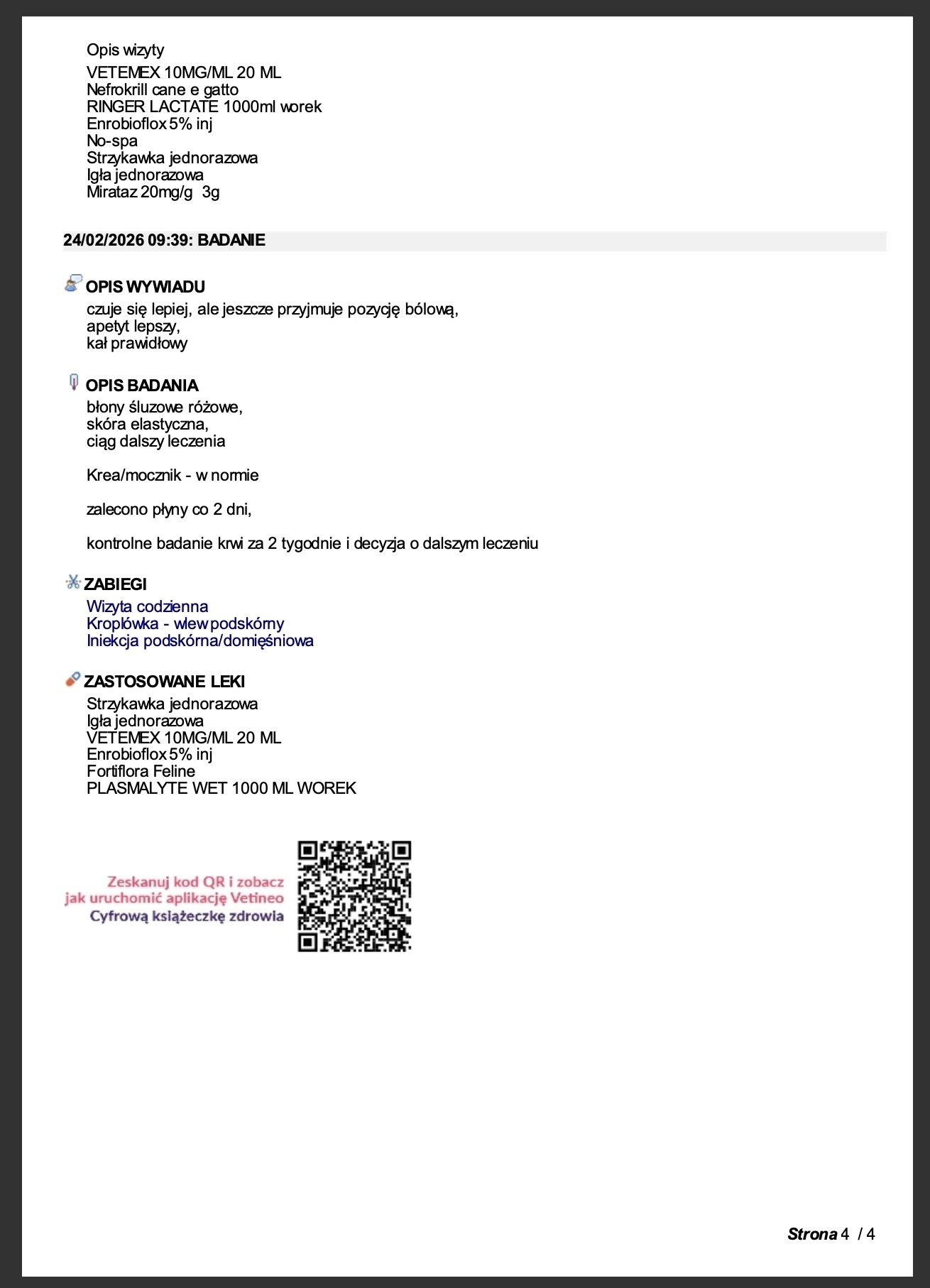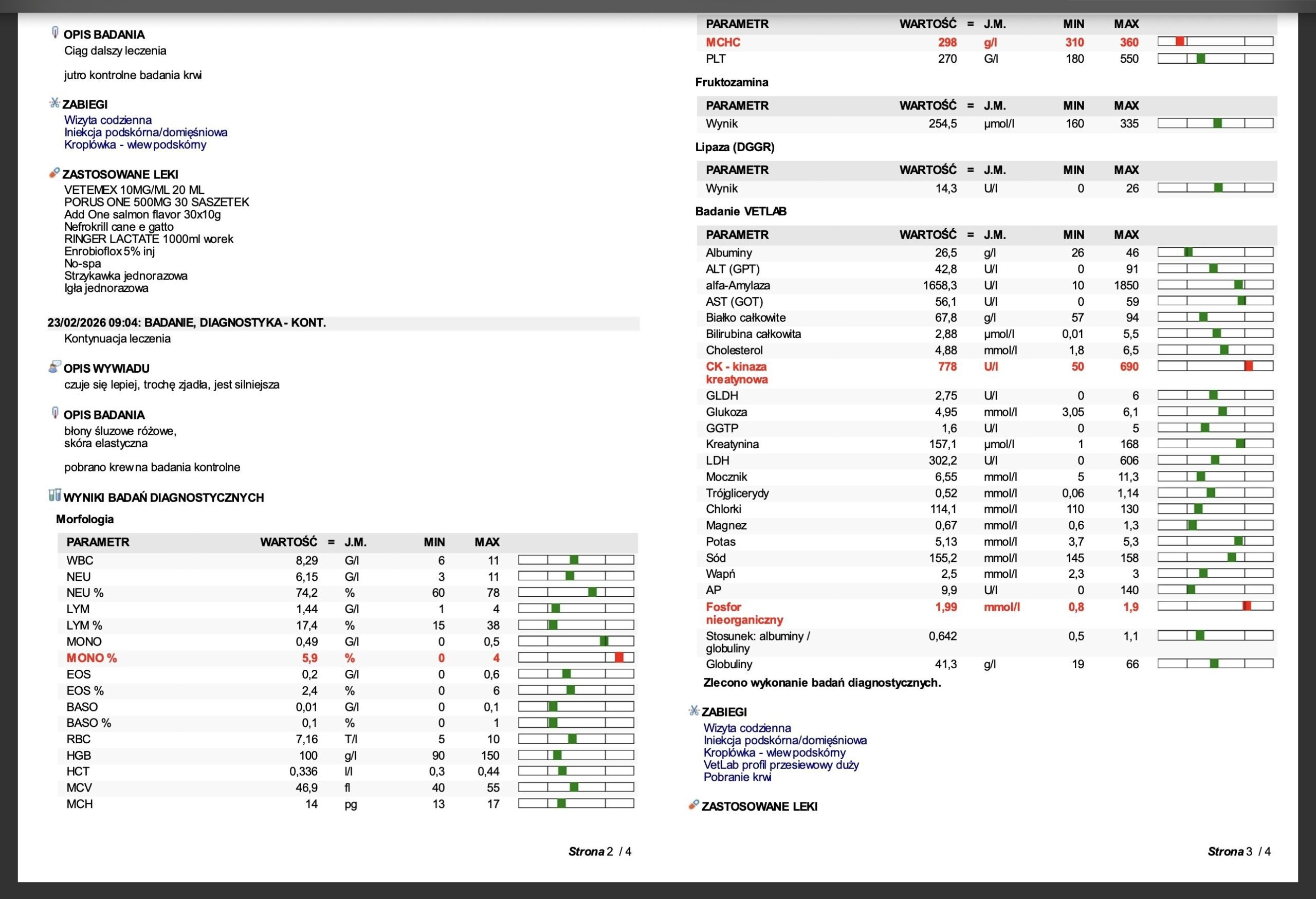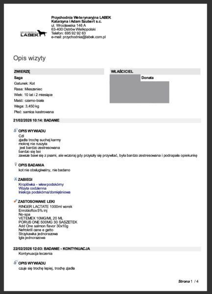 „Znów zachorowała moja Sagunia. Mimo leków wróciła choroba nerek. Widziałam, że znowu źle się czuje, znów boli ją brzuszek. Dlatego od razu zabrałam ją do kliniki na badanie. I niestety – Saga ma złe wyniki. Bardzo wysoka keratynina i mocznik pokazują, że nerki nie działają właściwie. Konieczne jest leczenie. Doktor pobrał też do badań płyn, który gromadzi się w okolicy nerek, ponieważ podejrzewa nowotwór. Wynik histopatologii będzie za parę dni.