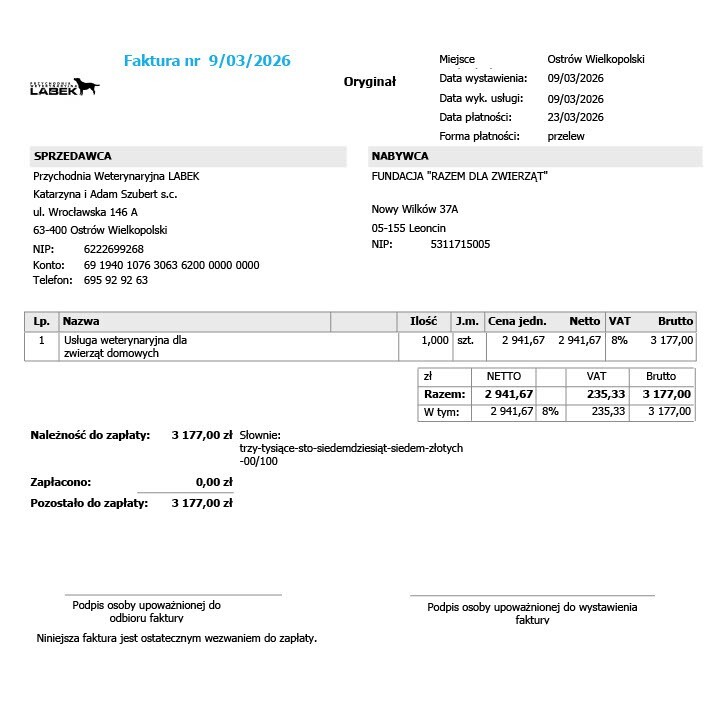 Dotychczasowe leczenie kosztowało 2158 zł Na tą kwotę dostaliśmy fakturę z kliniki i ją opłaciliśmy. Pozostało jeszcze 650 złotych, które przeznaczymy na opłacenie kolejnych faktur za leczenie Sagi.