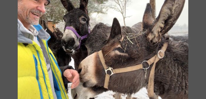 Pan Czarek zraz z mamą odwiedzili mnie wczoraj. Do tej pory tylko z internetu znali zwierzęta, którym pomagają. Okazało się, że najbardziej towarzyskie są osiołki, zwłaszcza Sówka, Jacuś i Okruszek.
